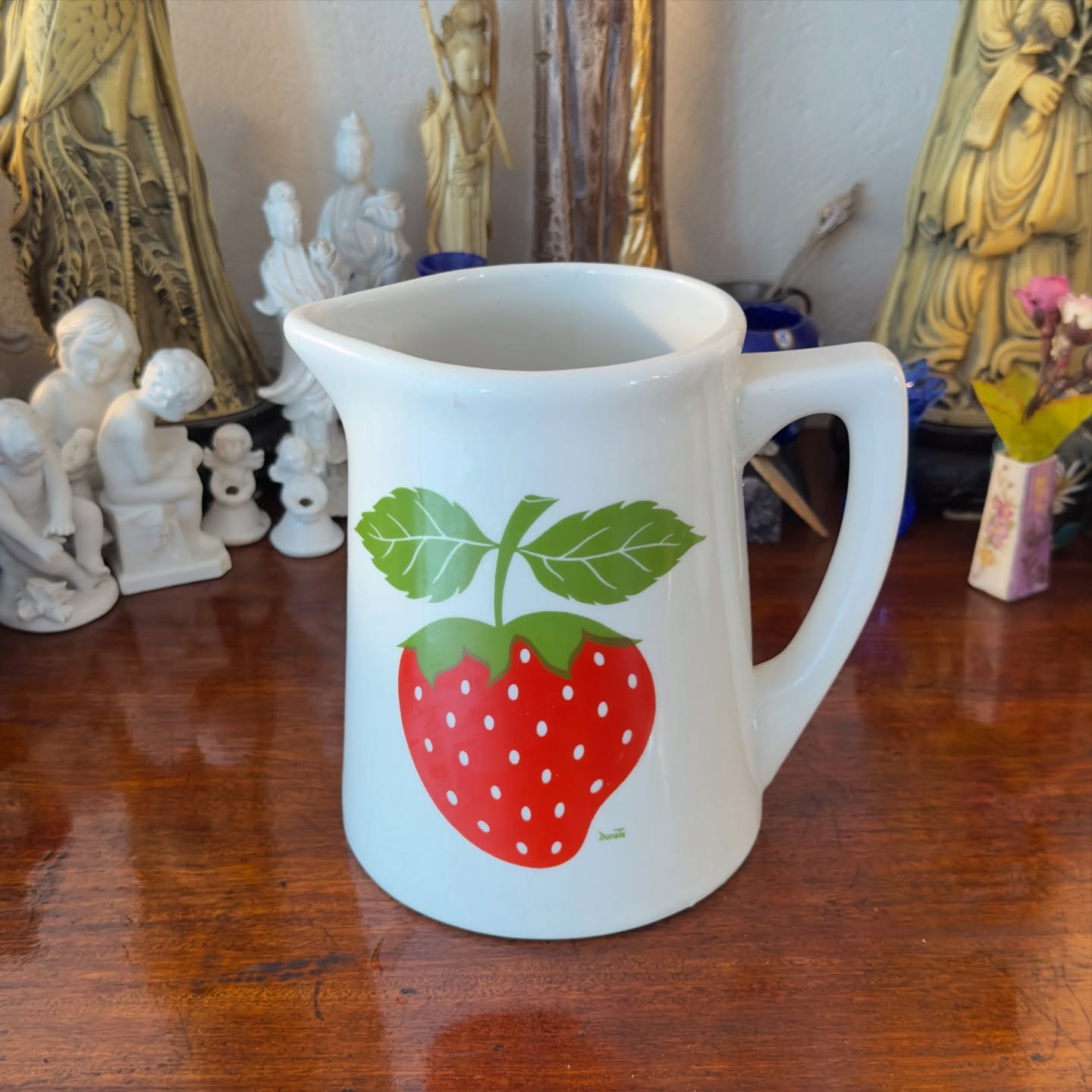 Jarra em cerâmica esmaltada da marca Durais, decorada com estampa de morango. Peça dos anos 80 em excelente estado de conservação.