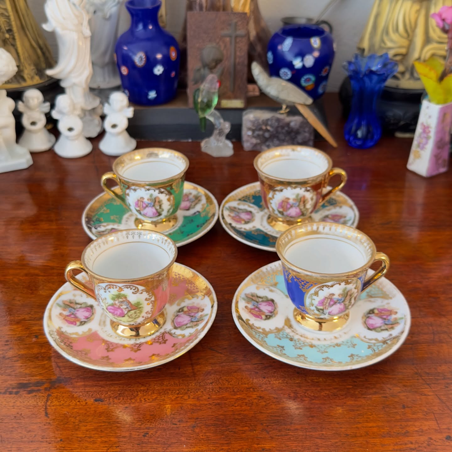 Para momentos especiais: Jogo de 4 xícaras de café Luiz XV. Cada par traz uma tonalidade vibrante com cenas galantes clássicas e acabamento luxuoso em ouro. Peças raras, ideais para colecionadores ou para elevar o nível do serviço de café.