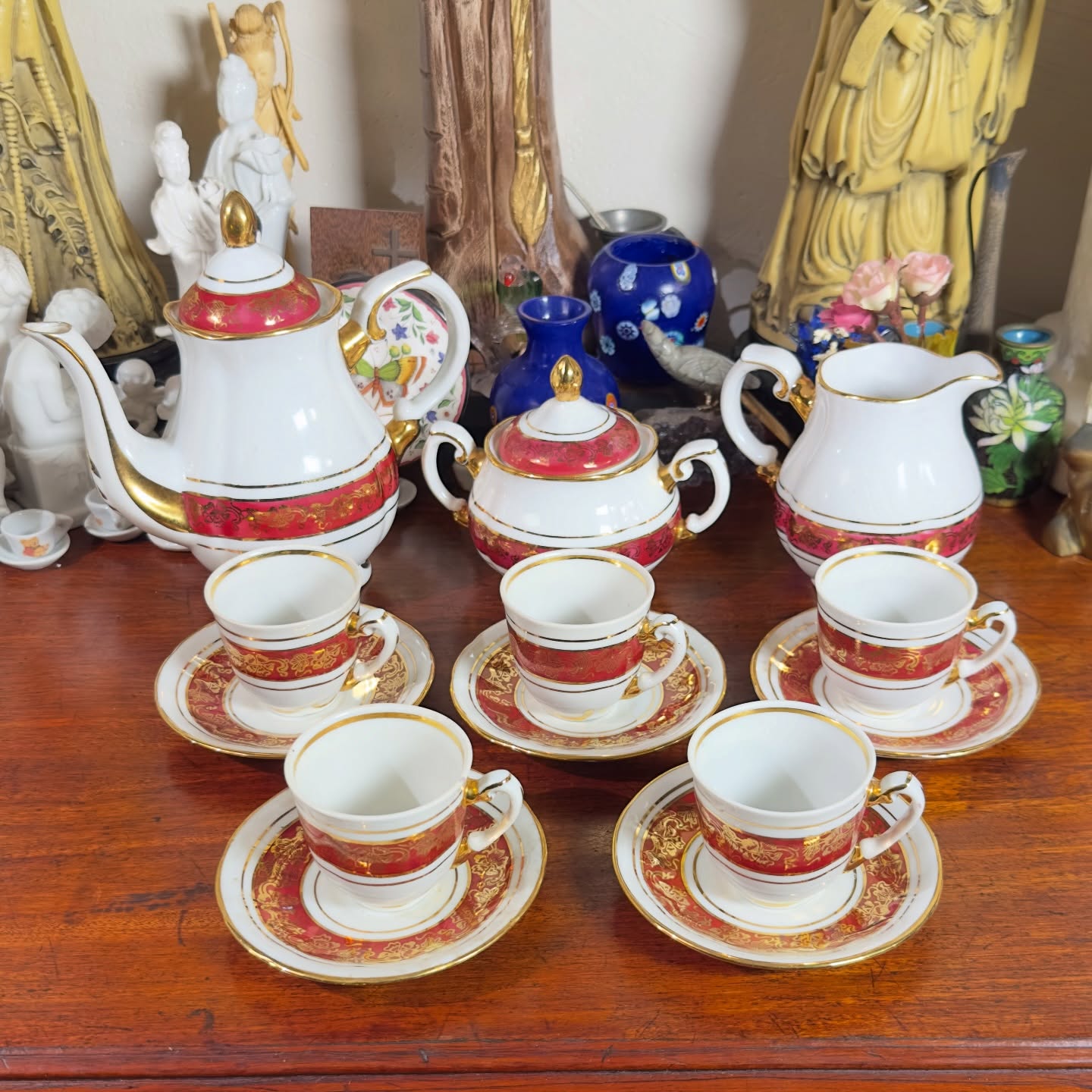 Peças impecáveis, sem marcas ou desgastes, conservando o brilho original. Composto por bule, cremeira, açucareiro e 5 xícaras com pires. Design elegante com detalhes em relevo e acabamentos em ouro.