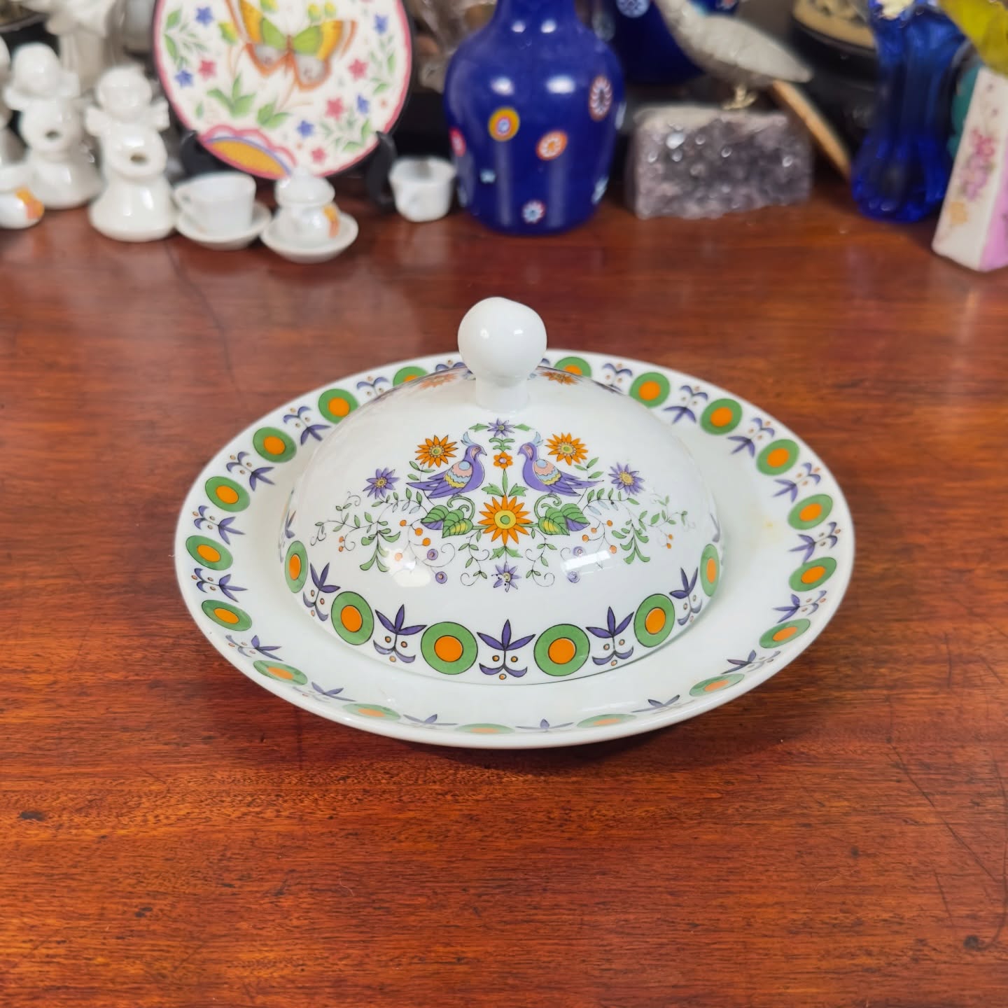 Manteigueira Schmidt, década de 70. Apresenta decorado floral colorido com pássaros centrais e bordas geométricas em tons de laranja, verde e roxo. Peça completa, composta por prato base e tampa com puxador original. Design clássico da época, preservando o brilho e a vivacidade das cores. Item de colecionador, conservado com cuidado.