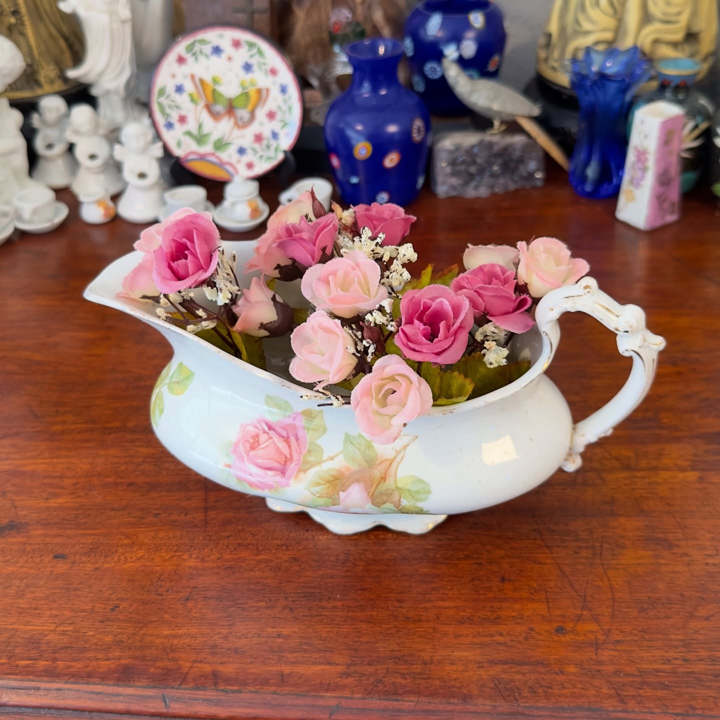 Molheira em porcelana inglesa John Maddock & Sons, início século XX. Apresenta o clássico selo verde da marca, garantindo a sua autenticidade. Decorada com rosas rosadas e delicados relevos na alça e bordas, mantém o charme da louça britânica de época.