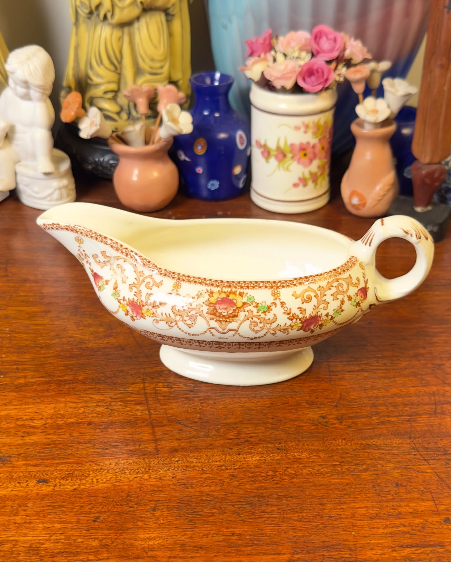 Molheira Empire Dorset, Inglaterra. Faiança com rica estampa floral e arabescos em tons terrosos. Uma peça charmosa e autêntica para servir ou colecionar. Perfeita para adicionar um toque clássico e elegante à sua mesa.