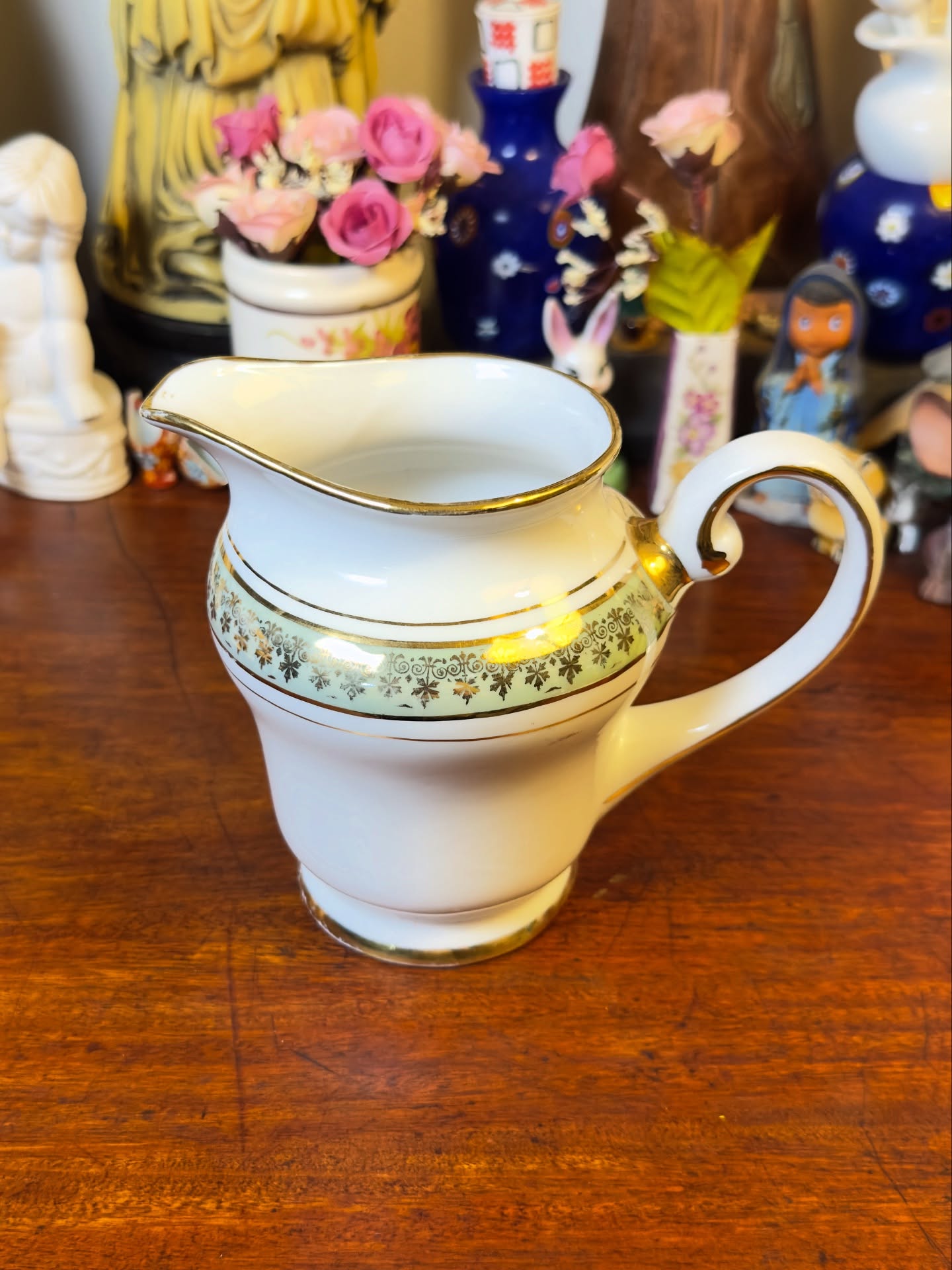 Leiteira em antiga porcelana Barão do Rio Branco, com estilo da marca ao fundo indicando produção entre 1959 e 1962. Apresenta delicados filetes dourados e elegante faixa em tom de época, conferindo charme e sofisticação à peça.