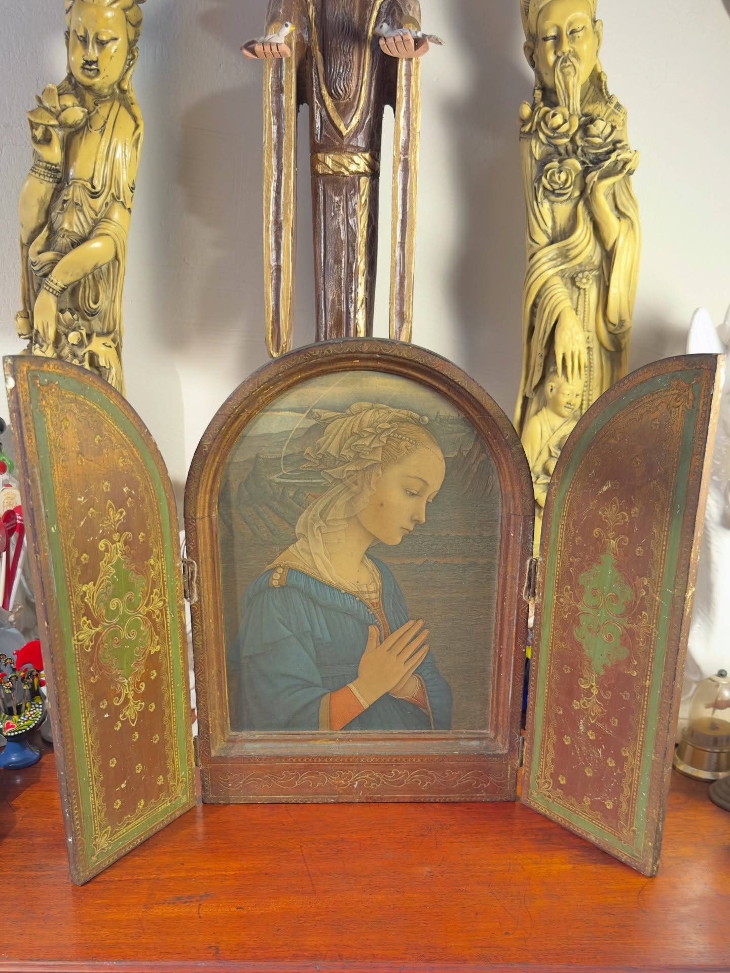 Em madeira com imagem central da Madona, inspirada na obra de Filippo Lippi. As portas laterais e a face externa apresentam rica decoração em estilo florentino, com padrões florais e detalhes dourados sobre fundo verde e terracota.