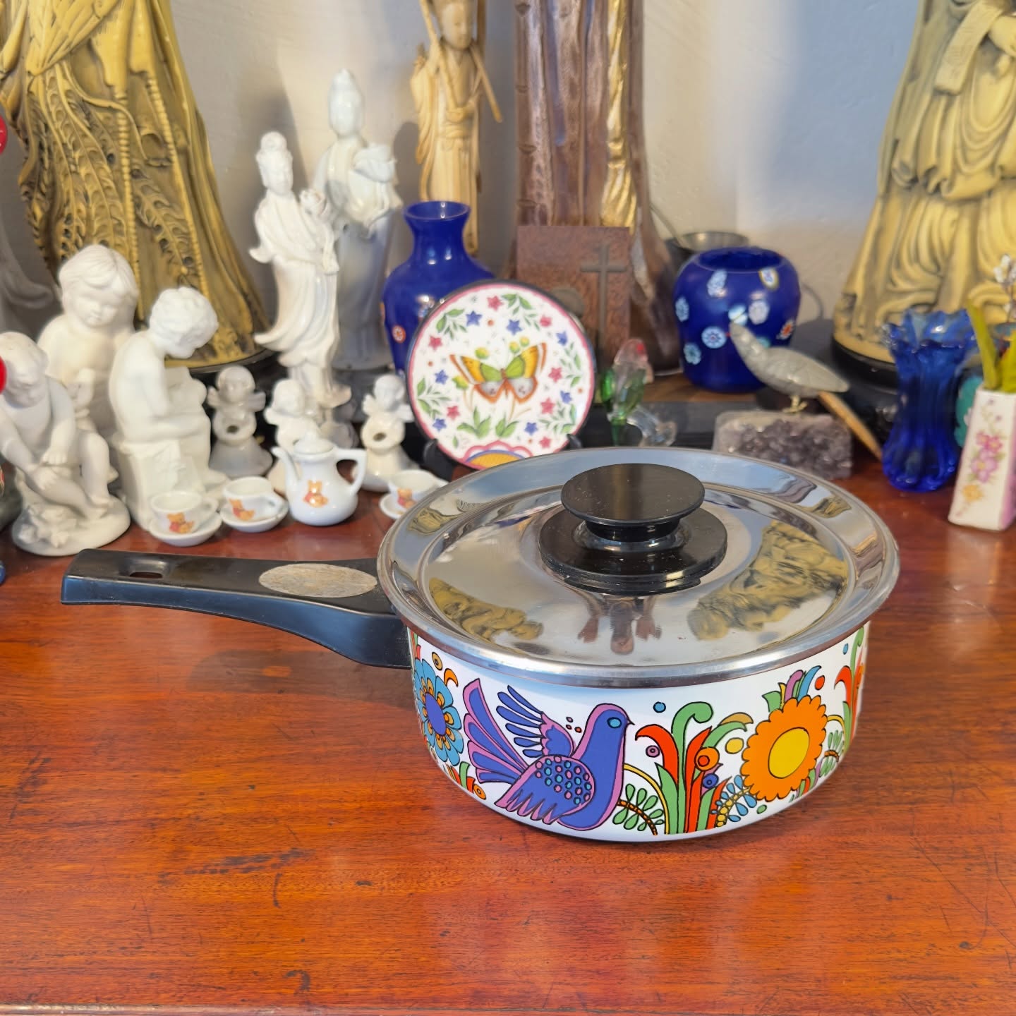 Panela alemã Asta, década de 70. Em metal esmaltado com vibrante estampa floral e pássaros, ícone do design europeu da época. Tampa metálica com brilho preservado e cabo em baquelite preta. Peça funcional e decorativo.