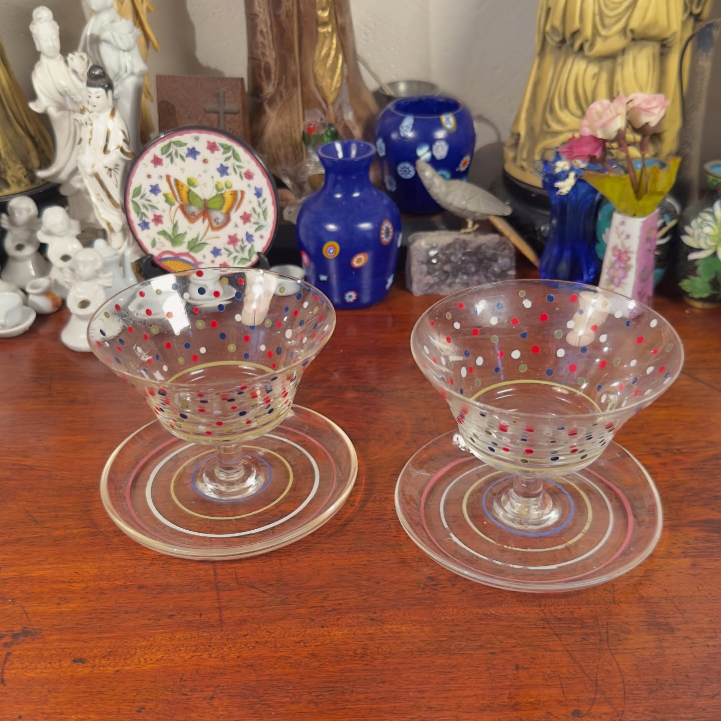 Conjunto composto por duas taças em vidro translúcido e decoração de poás coloridos em tons de vermelho, azul e amarelo, aplicados à mão.