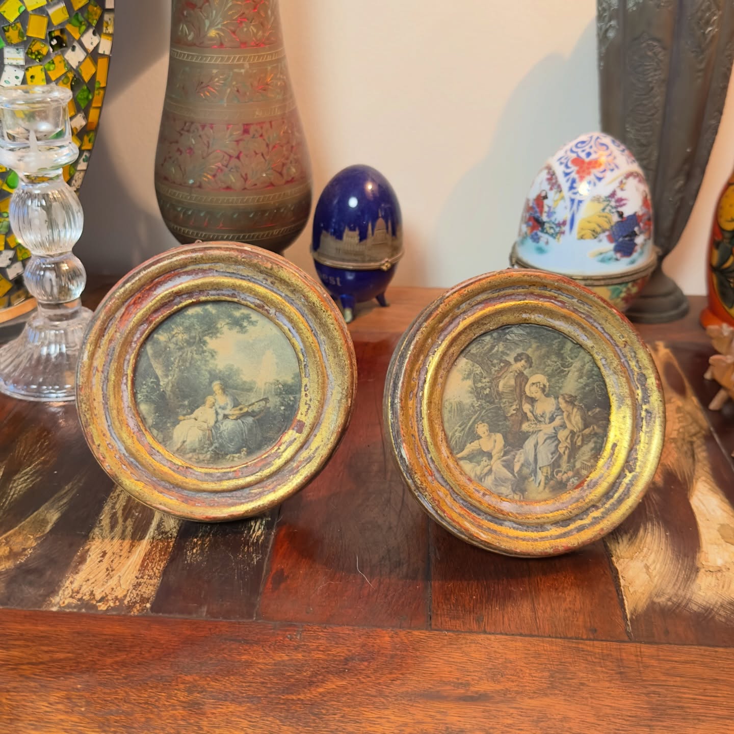 Moldura em madeira trabalhada e acabamento em ouro envelhecido. Peças apresentam cenas clássicas de época protegidas por vidro.