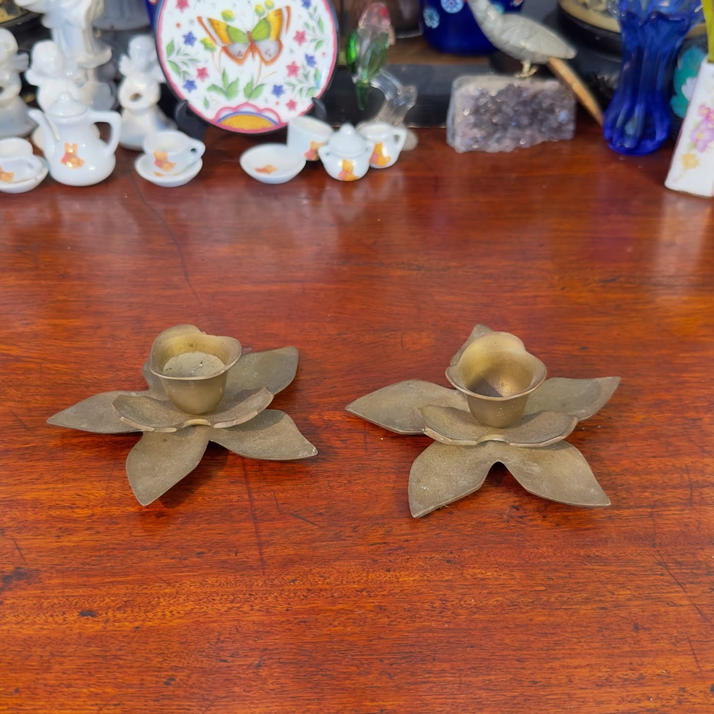 Com design orgânico que remete a pétalas de flores, as peças possuem acabamento fosco e centro elevado para acomodar velas, conferindo elegância e brilho metálico à decoração.
