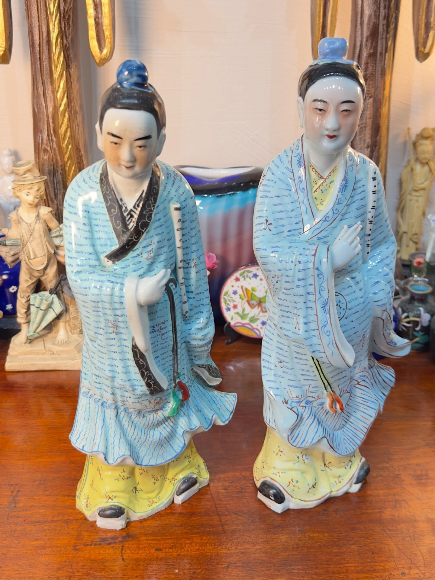 Conjunto de figuras orientais em porcelana esmaltada, produzidas pela oficina Li Sheng Tai entre o final da Dinastia Qing e o início do Período da República (c. 1890-1920). As peças apresentam vestimentas ricas em detalhes, com padrões florais e geométricos aplicados manualmente em tons de azul e amarelo sobre o fundo branco.