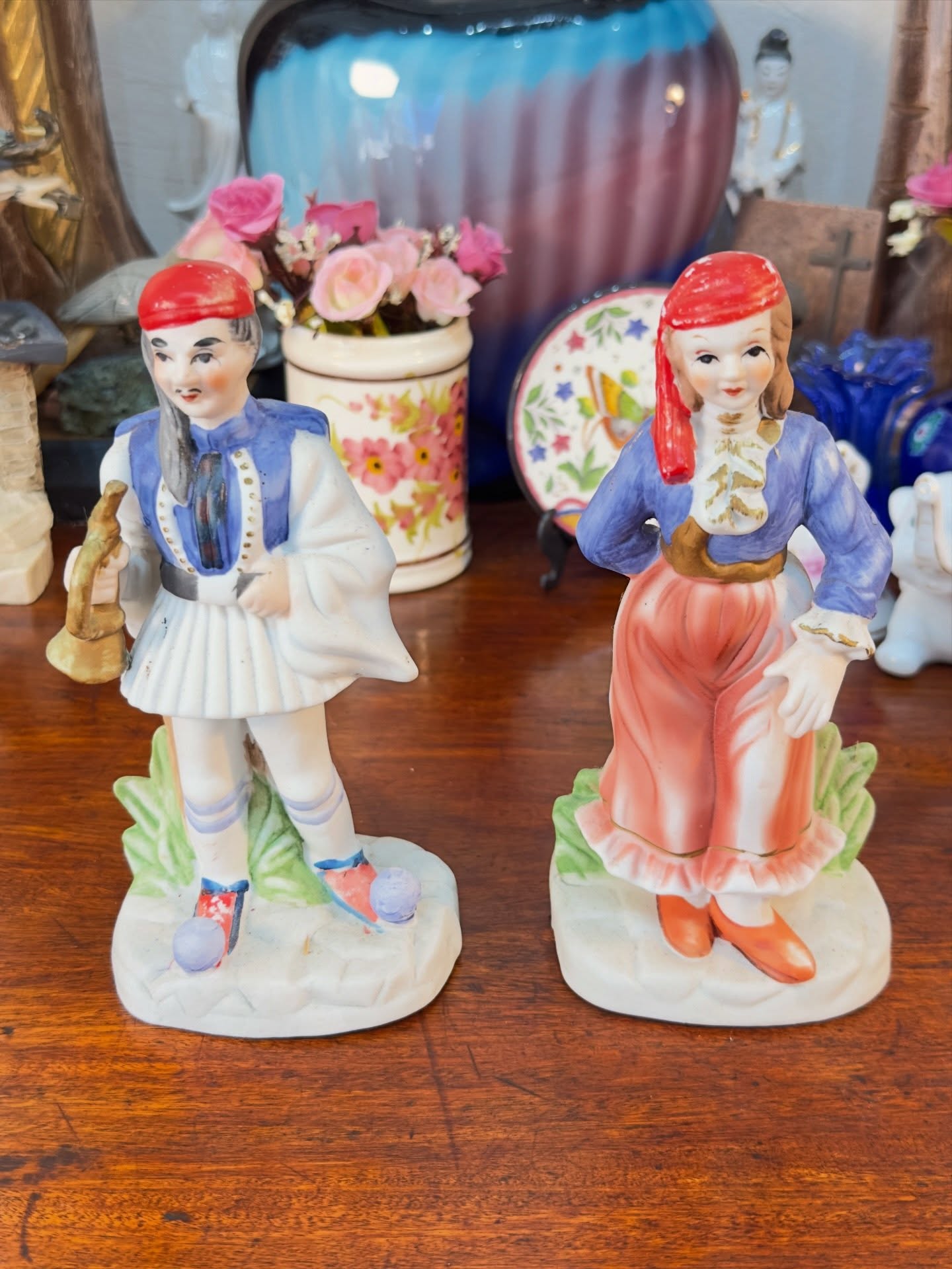 Par de esculturas em porcelana fria representando camponeses gregos com vestimentas folclóricas. O homem veste o clássico fustanella branco com colete azul, enquanto a mulher apresenta saia longa e lenço vermelho na cabeça