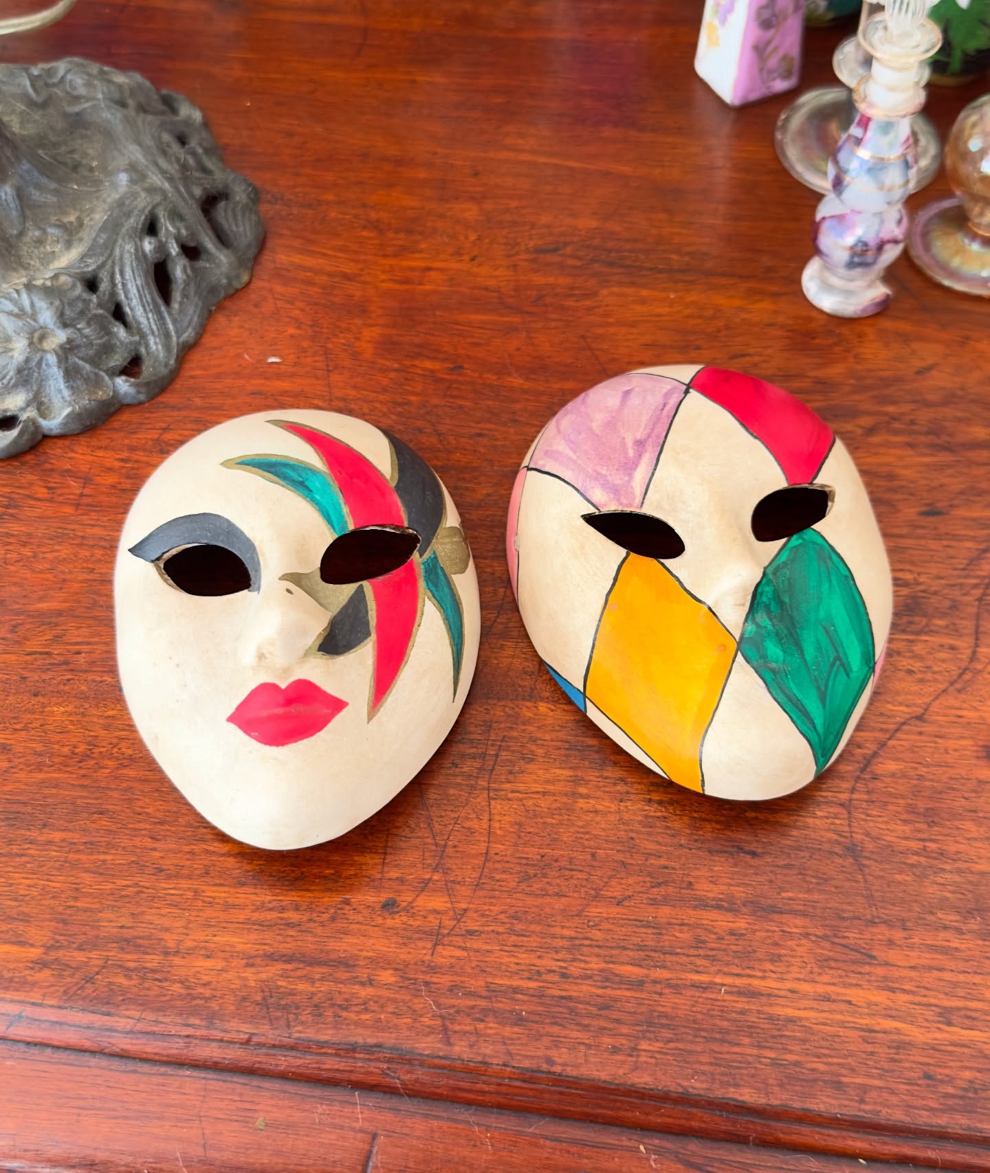 Par de antigas máscaras decorativas de parede em cerâmica, estilo veneziano. Pintadas à mão com motivos de Arlequim e traços abstratos. Possuem gancho traseiro para fixação. Apresentam marcas naturais do tempo no verso que não interferem na estética frontal.