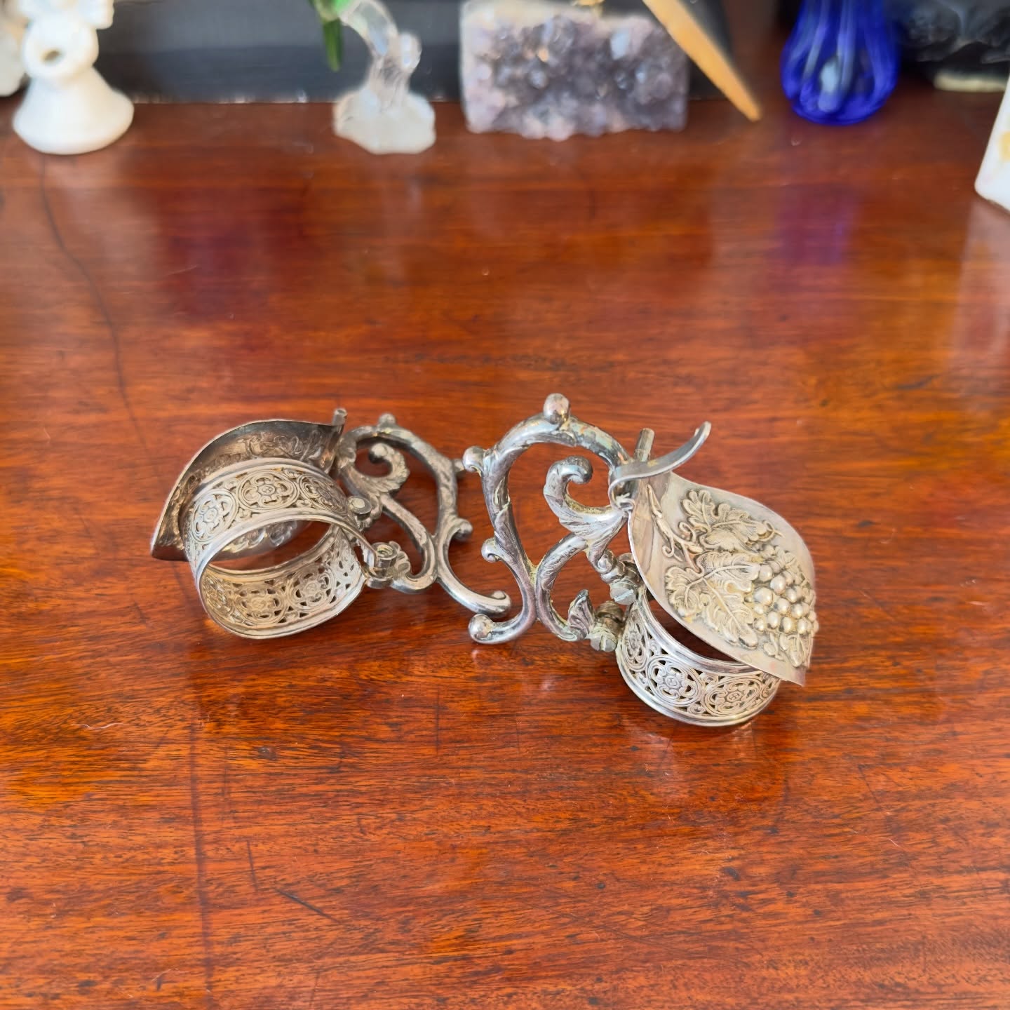 Antigo par de salva-gotas para gargalo de garrafa, em metal prateado. Decorado com relevos de uvas e folhas de videira nas tampas. Estrutura vazada com detalhes em volutas.
