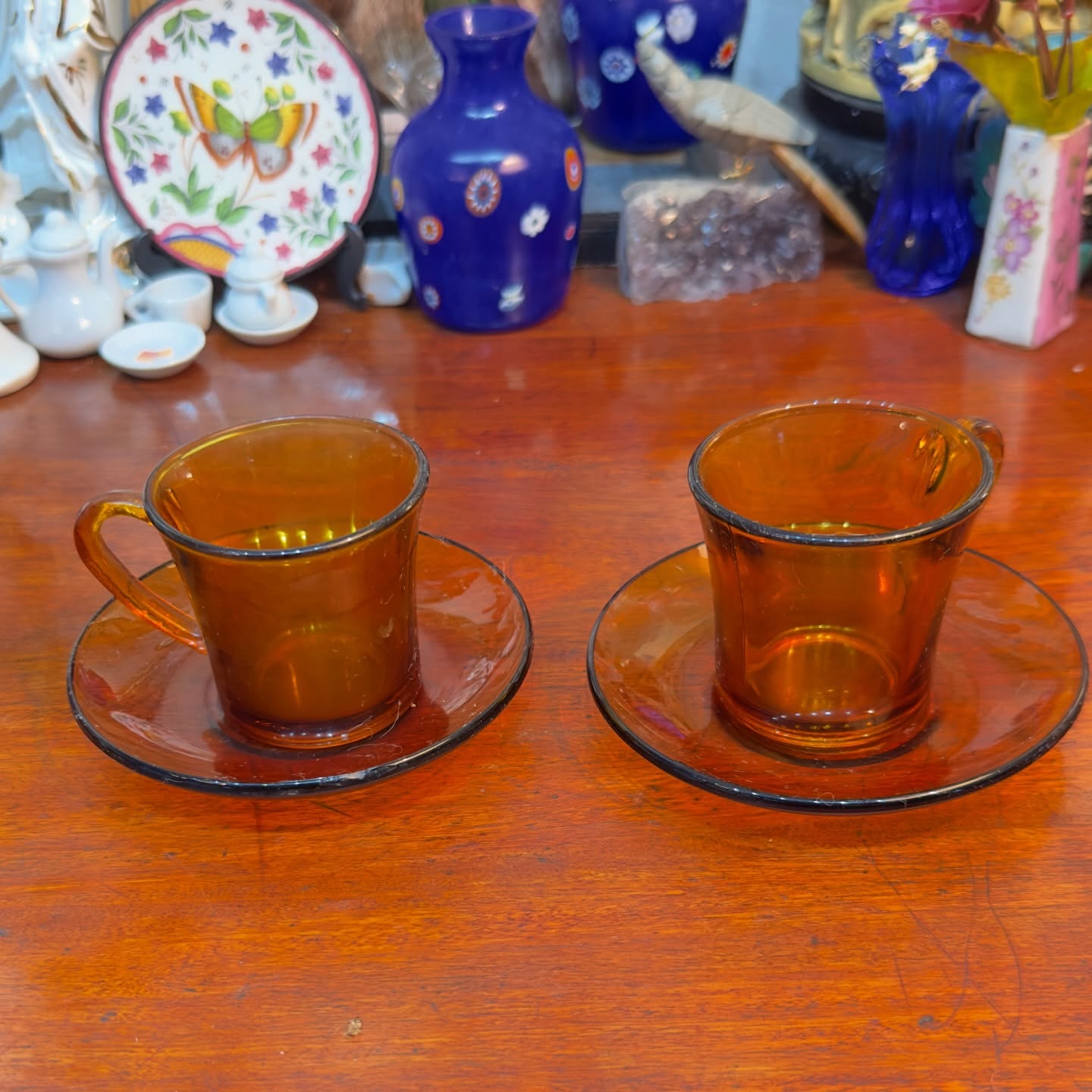 Conjunto de duas xícaras de café com pires em vidro temperado na cor âmbar. Peças com brilho preservado. Um dos pires possui um pequeno bicado na borda (detalhe na foto), sem comprometer a estrutura. Design clássico duralex.