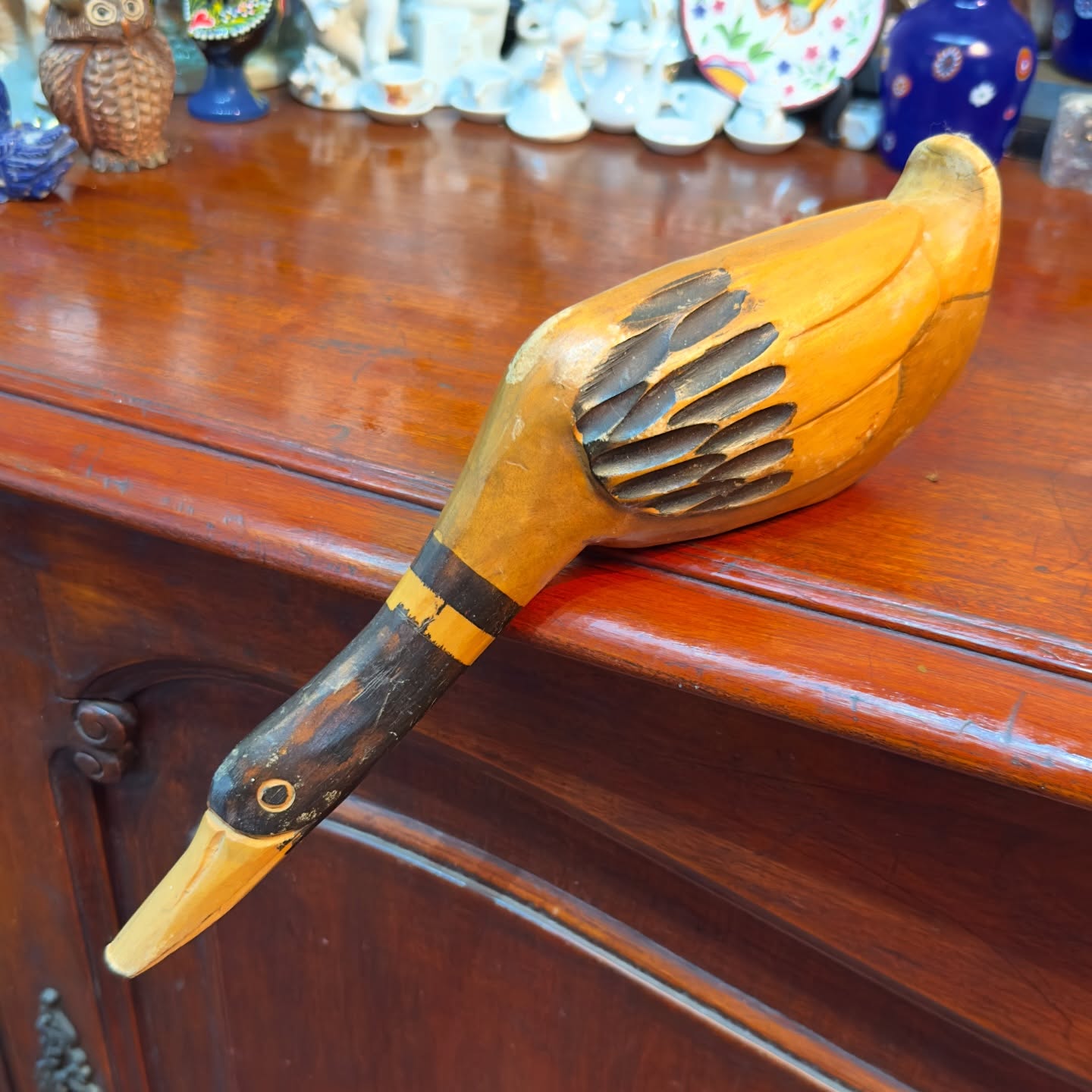 Escultura em madeira com entalhes manuais que simulam a textura das penas. Apresenta corpo em tom natural e pintura detalhada na cabeça em tons de preto e amarelo.