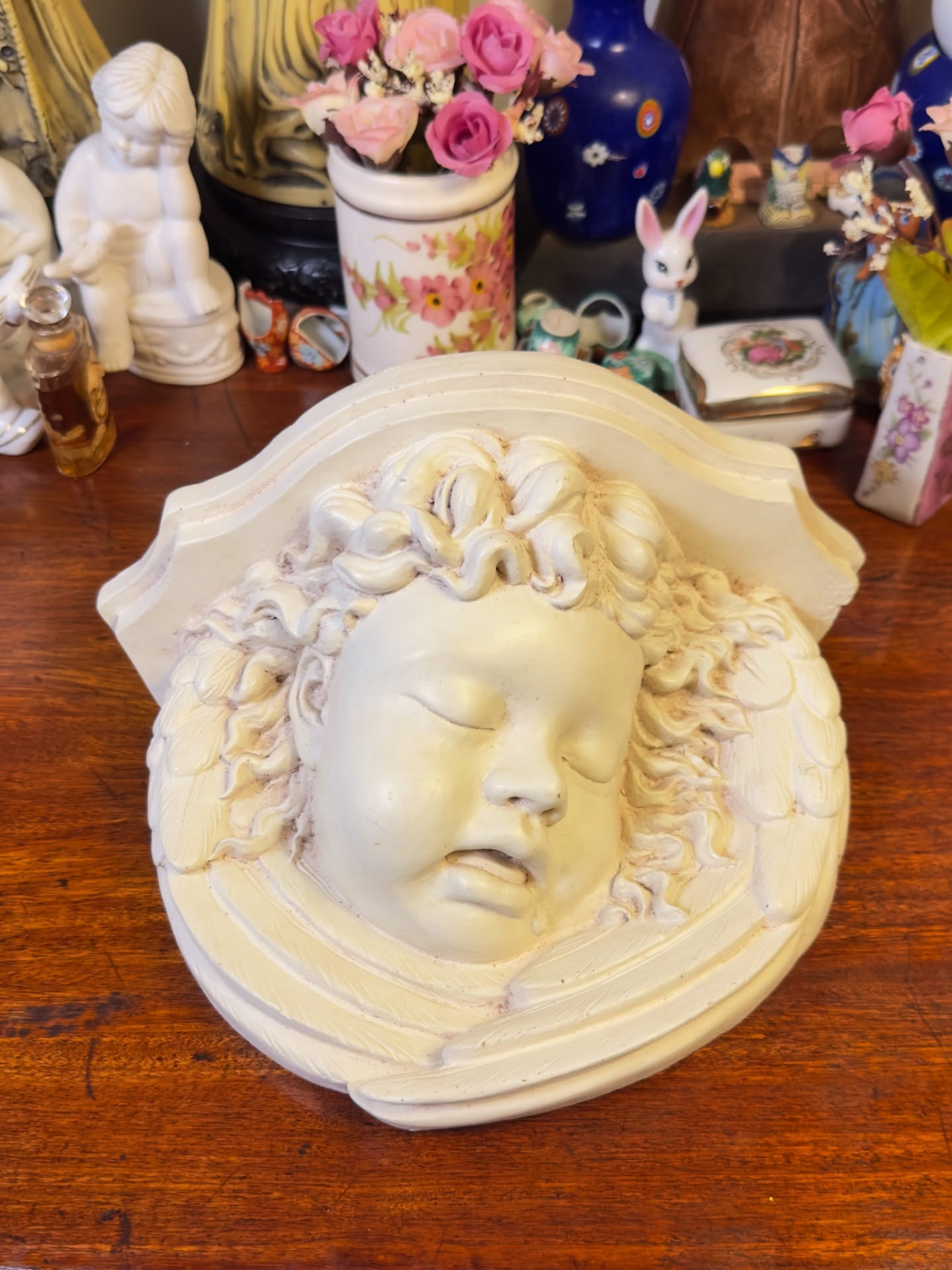 Peanha em resina delicadamente esculpida, apresentando um rosto angelical de expressão serena e detalhes refinados.