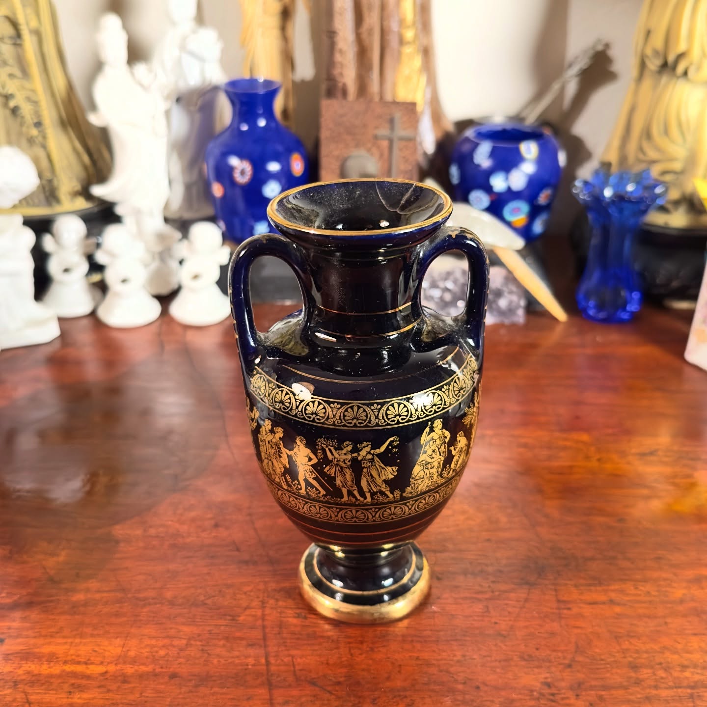 Pequena ânfora grega em cerâmica esmaltada azul cobalto, com detalhes em ouro 24k. Decoração com figuras da mitologia. Fabricada na Grécia (Hand Made in Greece). Possui um discreto restauro na borda superior, conforme visível nas fotos.