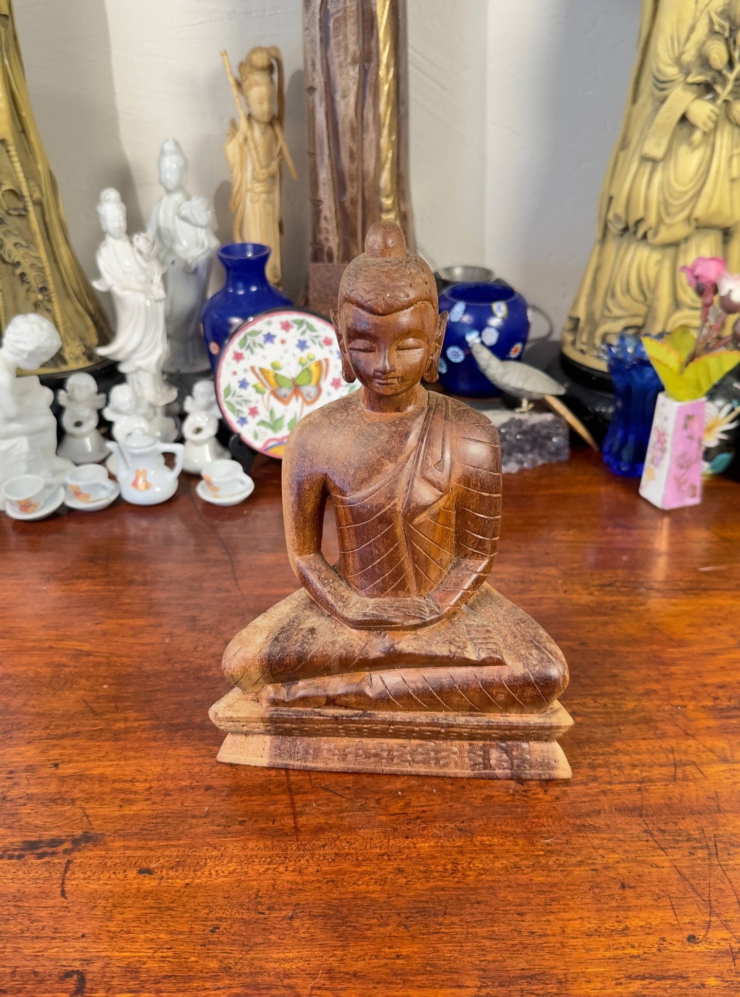 Pequena escultura de Buda em madeira maciça. A peça apresenta entalhes manuais detalhados e acabamento rústico que valoriza o material natural.
