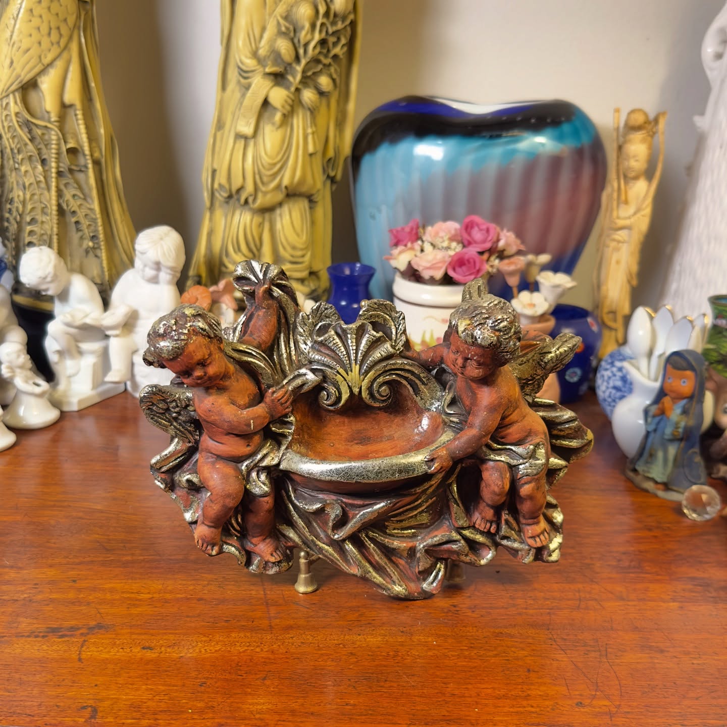 Dois querubins esculpidos seguram a bacia, com acabamento que simula bronze envelhecido em estilo Barroco.