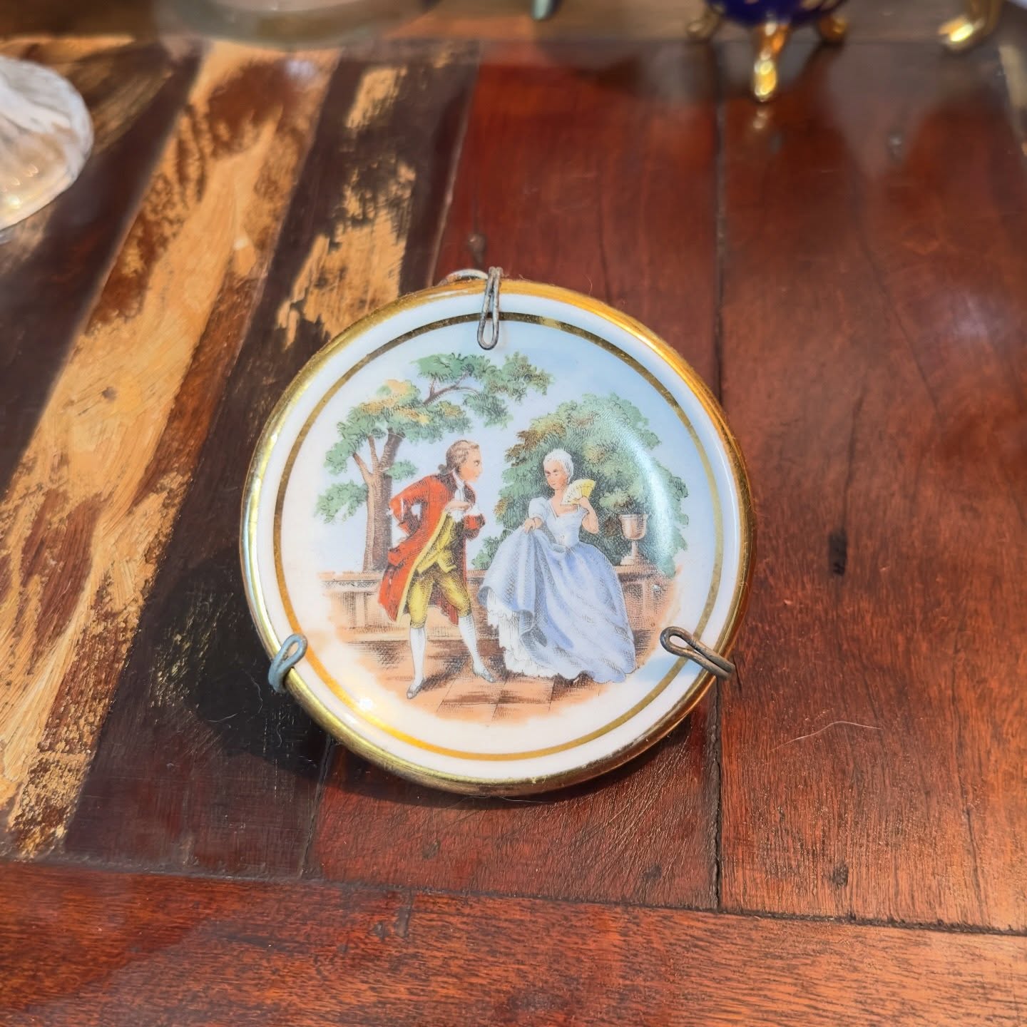 Pratinho em porcelana com borda filetada a ouro e pintura policromada. A cena central retrata um casal em estilo rococó em um cenário de jardim. Acompanha suporte metálico original com mola, pronto para pendurar.