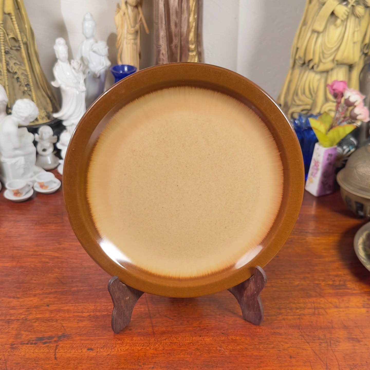 Prato de sobremesa Grés Oxford. Apresenta design típico de época, com degradê em tons de marrom e bege.