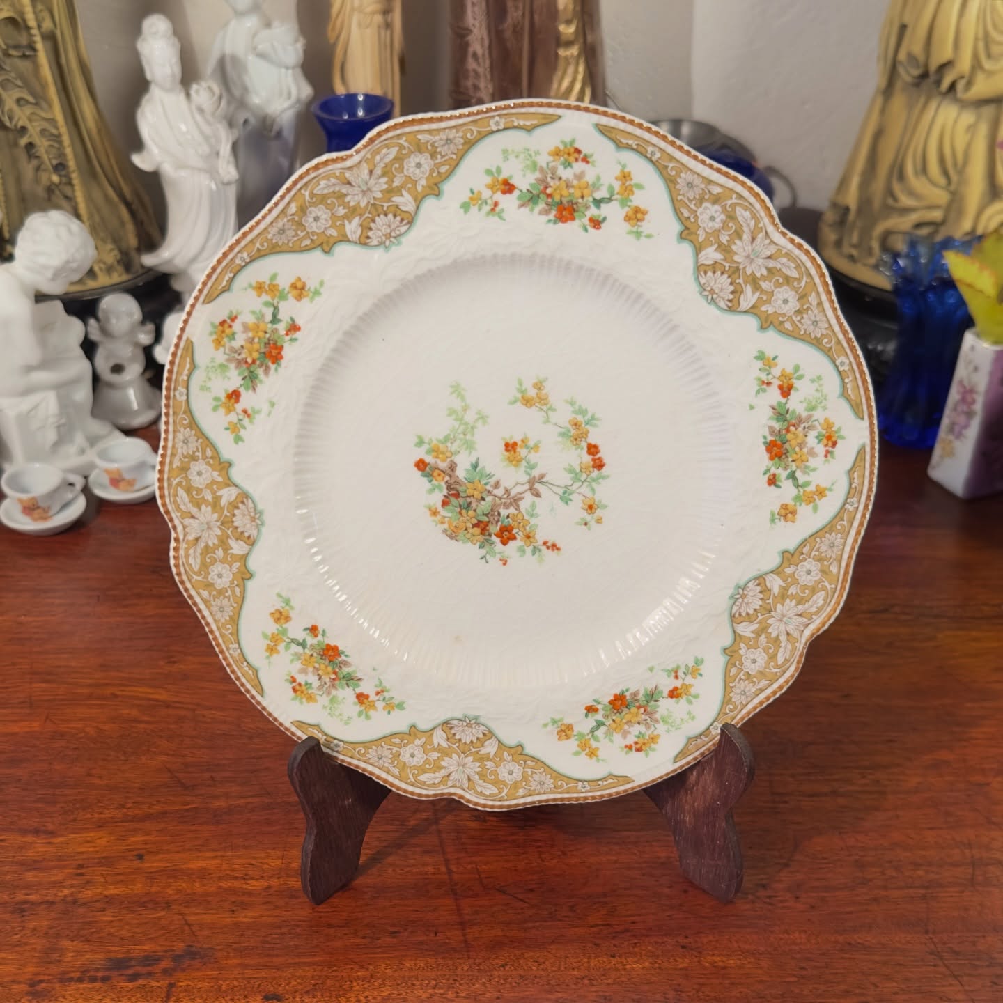 Antigo Prato de Sobremesa Johnson Bros England, linha Pareek, padrão Mentone. Peça inglesa com bordas recortadas, detalhes florais e acabamento em tons de dourado e creme, ótima opção para decoração.