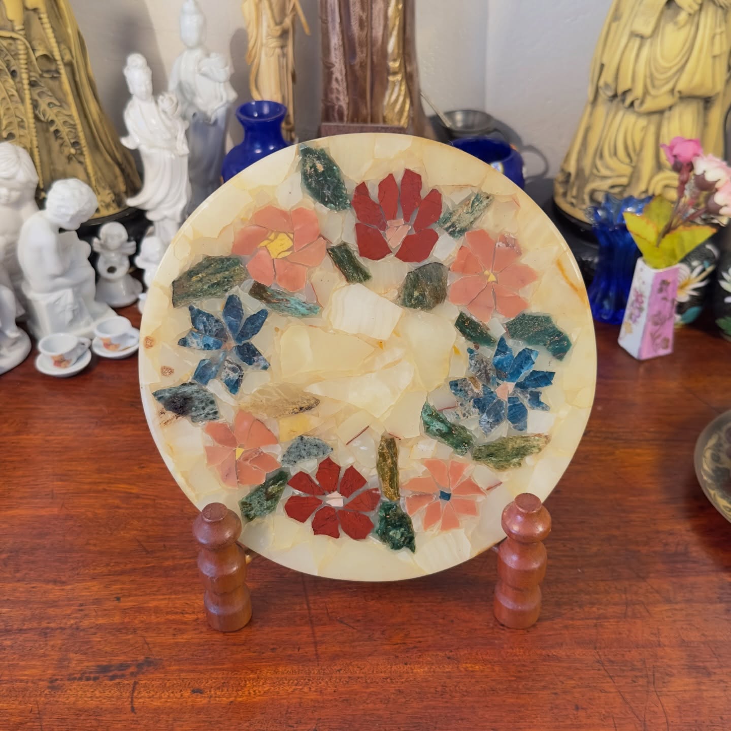 Prato Decorativo em Mosaico de Pedras Naturais. Peça artesanal com delicado padrão floral composto por pedras coloridas incrustadas sobre base de mármore ou alabastro. Ideal para uso como centro de mesa, descanso de objetos ou peça de exposição em suporte. Não acompanha expositor de mesa.