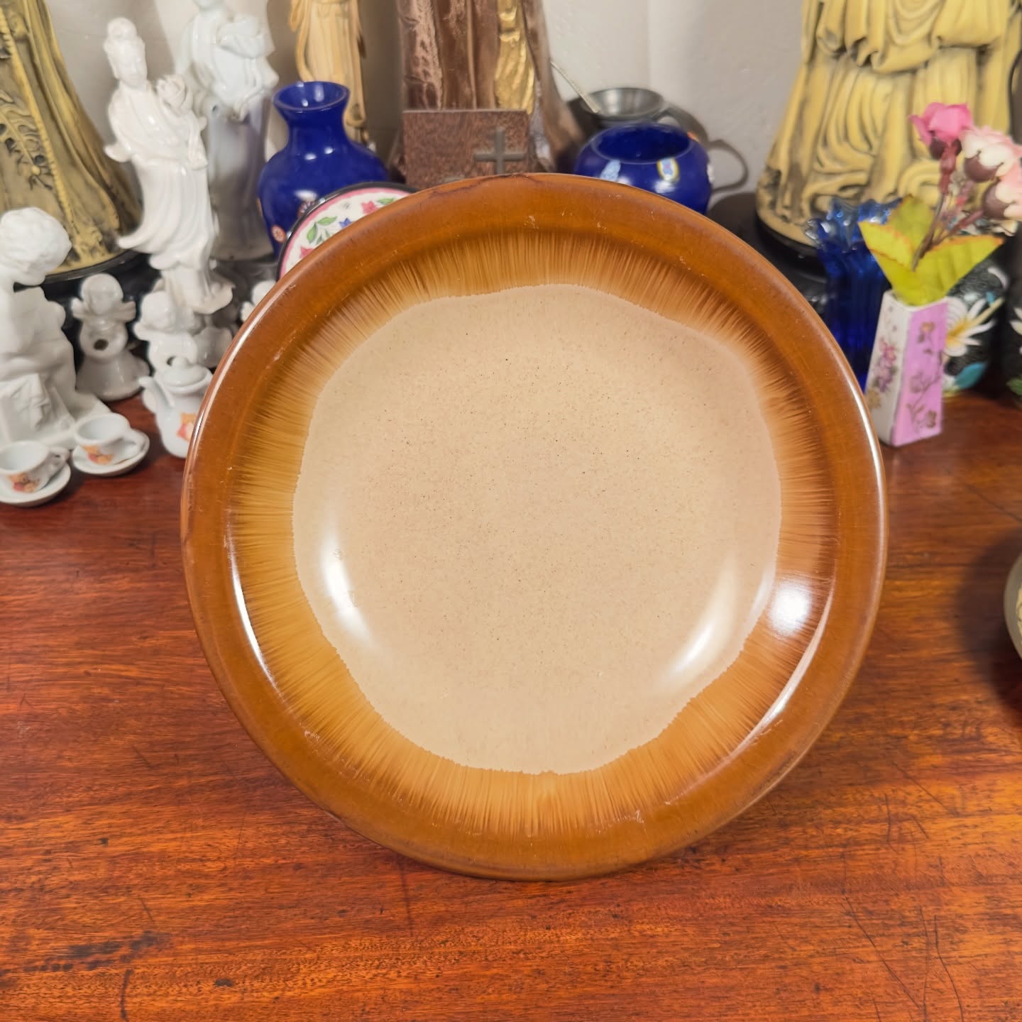 Com degradê em tons de marrom e bege. Peça em excelente estado de conservação, com acabamento esmaltado característico da época.