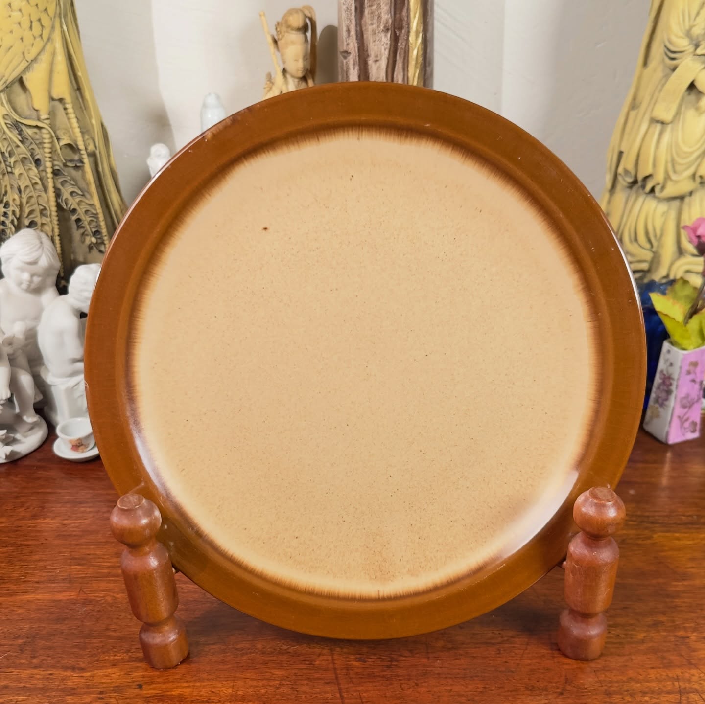 Prato raso em Grés Oxford, fabricado no Brasil. Apresenta design típico dos anos 70 e 80, com degradê em tons de marrom e bege.