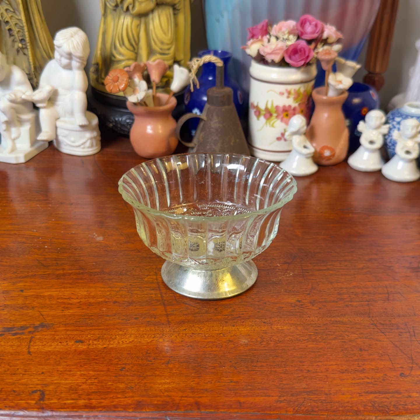 Vidro canelado com detalhe em estrela no fundo e base de metal prateado. Peça antiga, ideal para sobremesas, doces ou como porta-joias decorativo.