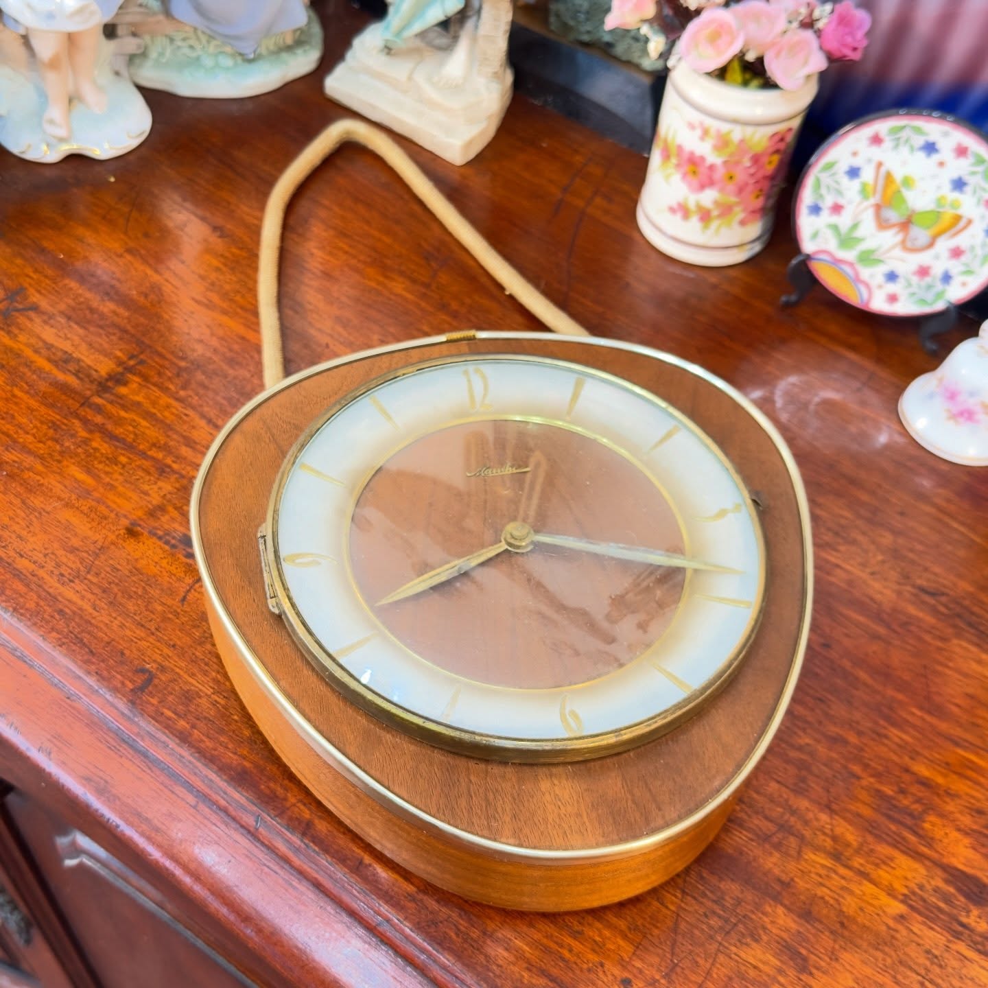 Relógio de parede alemão da marca Mauthe, datado da década de 1950. Apresenta design mid-century com corpo em madeira de tom quente e visor circular protegido por vidro articulado com aro dourado. Possui alça superior, característica de modelos de suspensão da época. Necessitando de manutenção técnica na máquina para voltar a marcar o tempo.