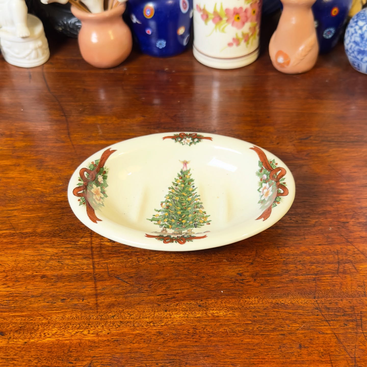 Saboneteira de cerâmica em formato oval, fabricada na Inglaterra pela Crown Heritage. O design apresenta um tema natalino clássico, uma árvore de Natal central, guirlandas e fitas vermelhas. Ideal para adicionar um toque festivo e elegante ao banheiro ou lavabo.