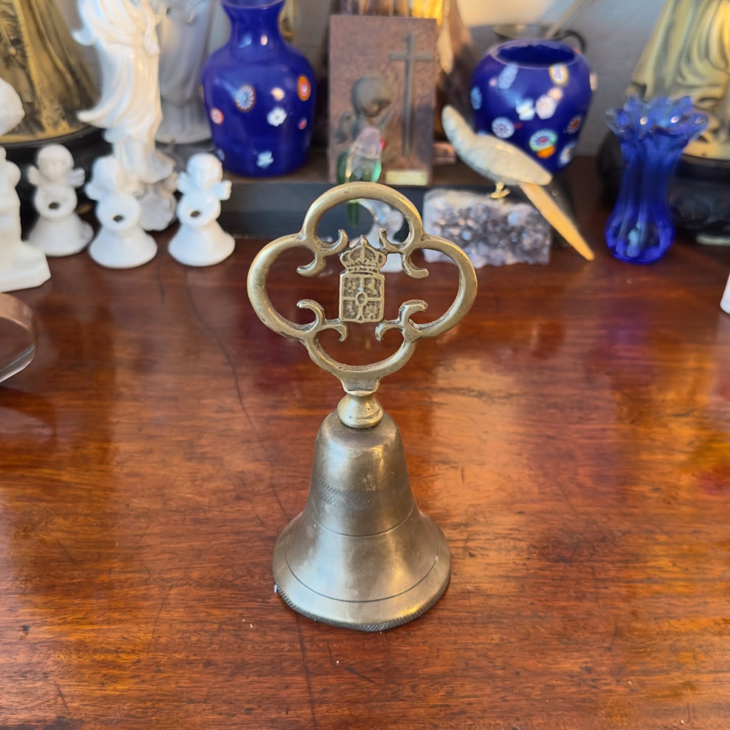 Sininho de mesa antigo em bronze, com cabo ornamentado por brasão coroado. Peça sólida com pátina natural do tempo e badalo original. Som nítido.