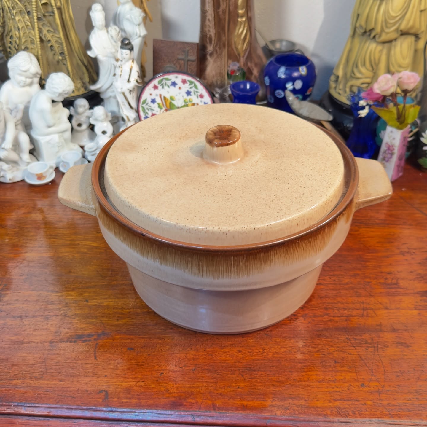 Sopeira Oxford em cerâmica esmaltada. Design com alças laterais e tampa, mantendo a temperatura dos alimentos. Acabamento em tom areia com borda em degradê marrom. Peça refratária, resistente e funcional para o serviço à mesa. Excelente estado de conservação.