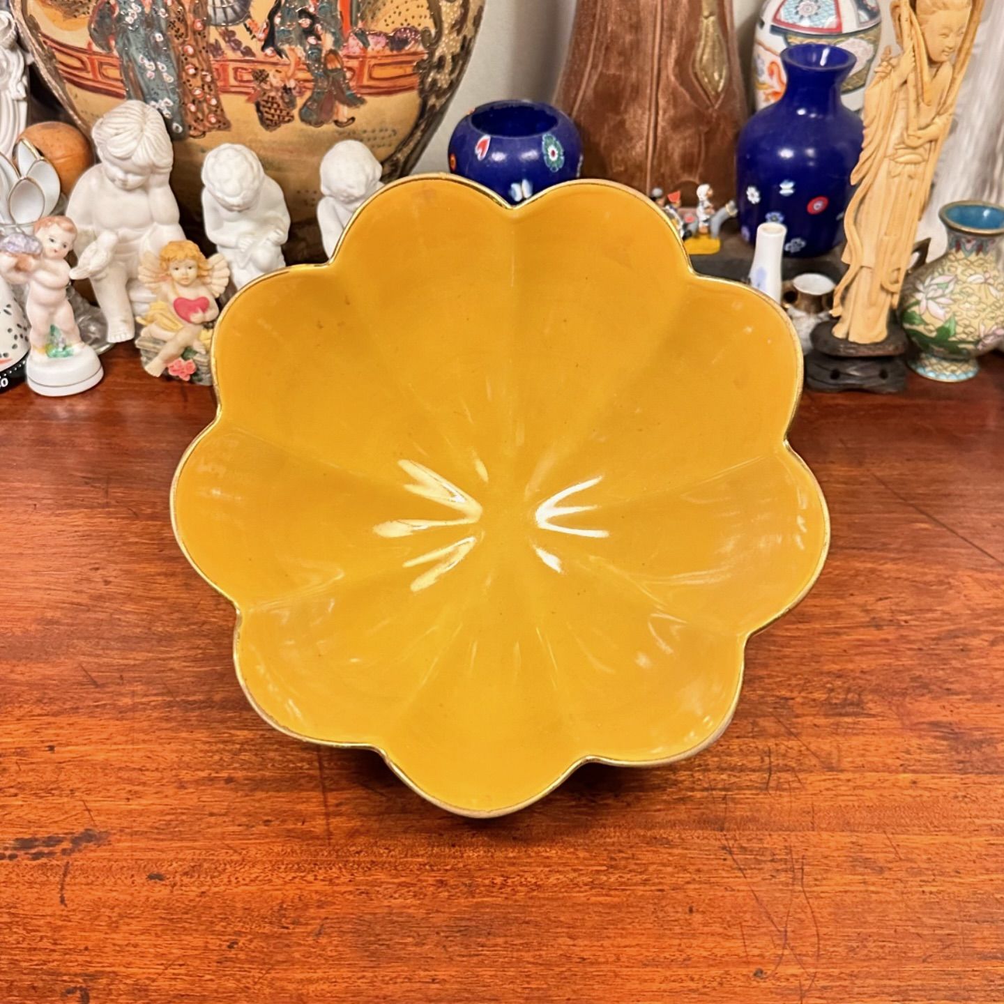 Elegante tigela central de sobremesa em porcelana antiga, ricamente decorada com delicados motivos florais pintados à mão, refletindo um trabalho artesanal de rara beleza e sofisticação.
