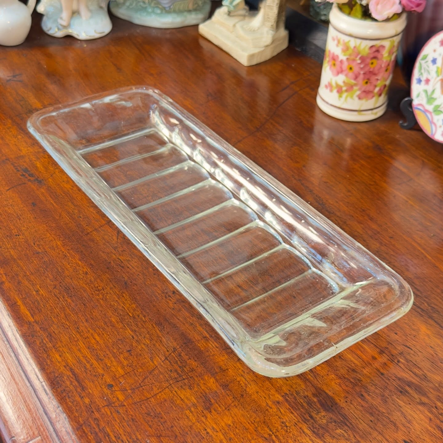 Travessa em vidro transparente com fundo trabalhado em relevo canelado. Peça versátil para servir petiscos, pães ou organizar pequenos objetos em aparadores. Apresenta design limpo e funcional, facilitando a composição com diferentes louças.
