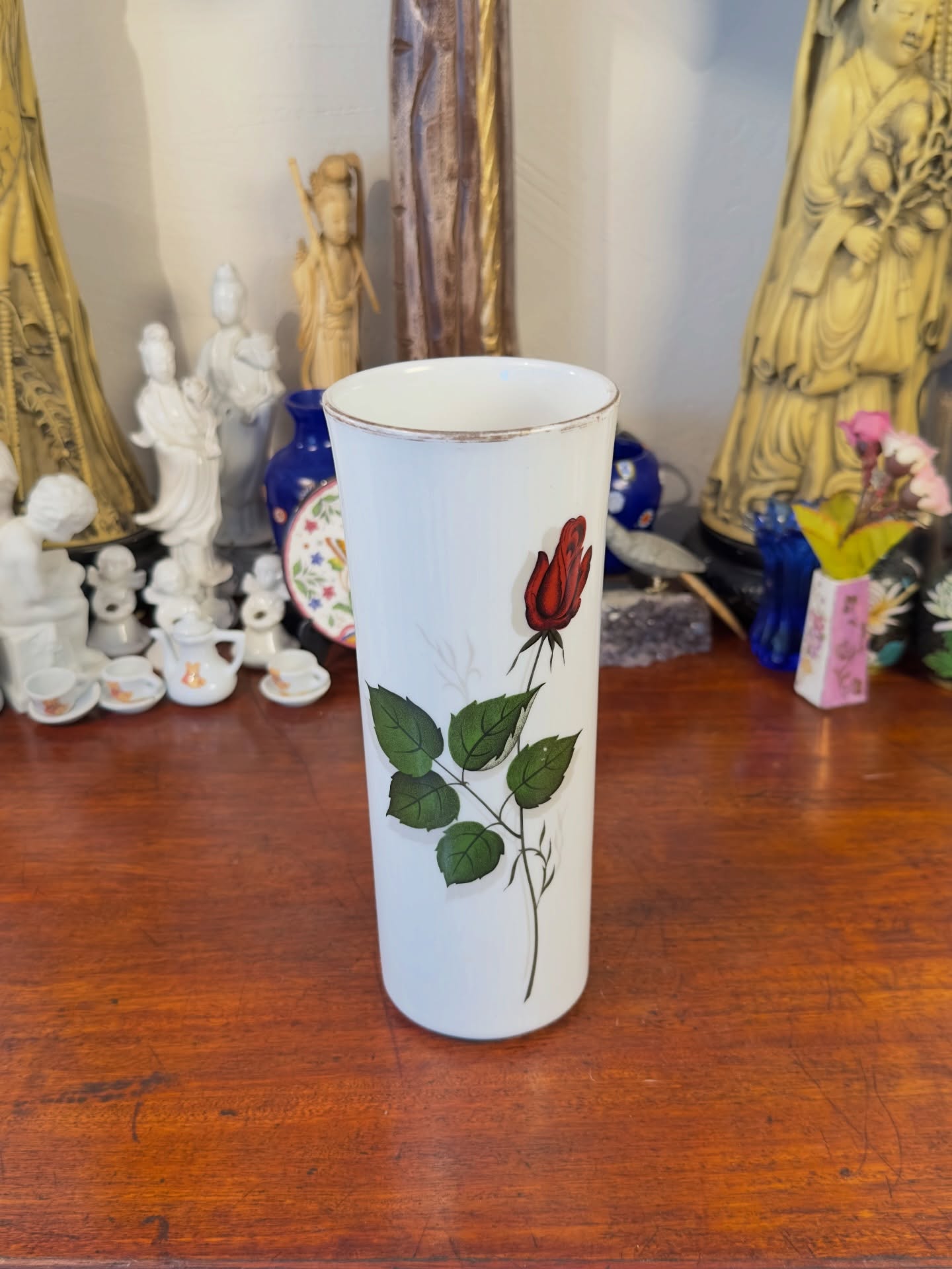 Vaso em porcelana alemã Winterling Marktleuthen, Bavária. Peça cilíndrica branca decorada com estampa de rosa vermelha solitária e folhagens detalhadas. Apresenta design clean e elegante, com selo de autenticidade na base.