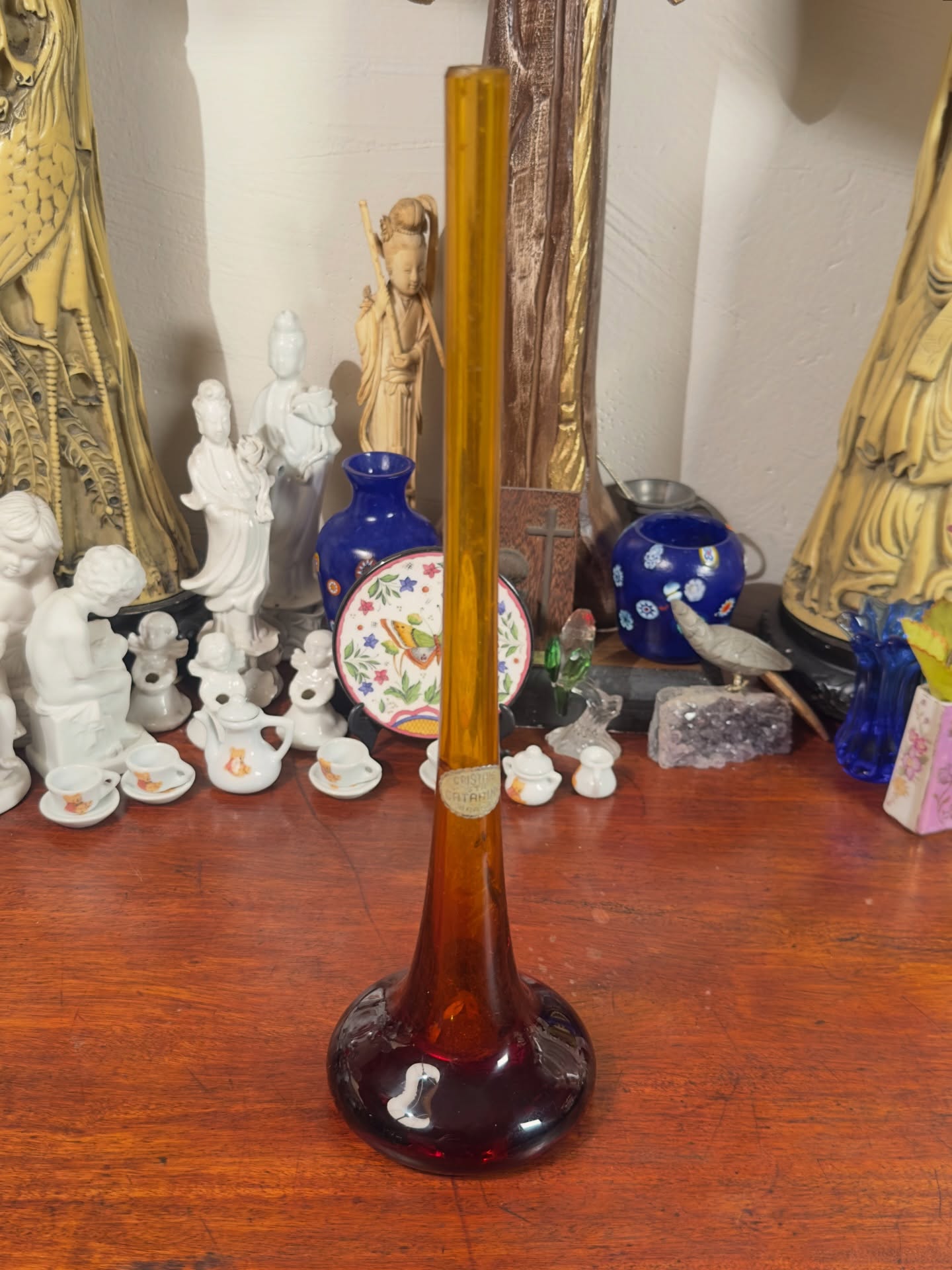 Vaso Solitário Cristais Santa Catarina, em vidro cor âmbar. Peça numerada com selo original de fabricação. Apresenta restauro no pescoço, conforme detalhado nas fotos.