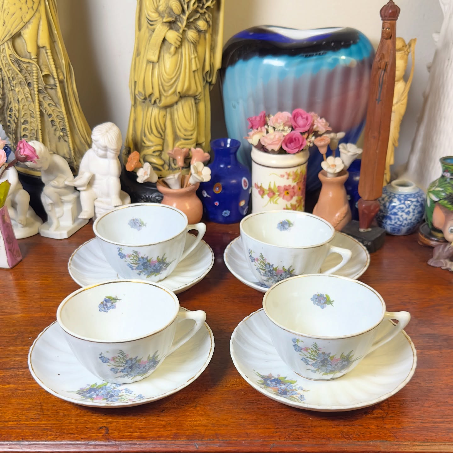 Xícara de chá em porcelana Utinga. Peças fabricadas nos anos 50, caracterizadas pela modelagem canelada e acabamento em filete de ouro na borda. A decoração floral predominantemente em tons de azul é um marco do design vintage brasileiro.